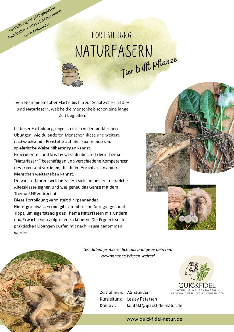 In dieser Fortbildung geht es darum pflanzliche und tierische Fasern kennenzulernen. In verschiedenen kleinen Projekten werden wir uns den Tag über damit beschäftigen, wie das Thema Naturfasern im Kindergarten oder in der Grundschule eingesetzt werden kann. Wir werden unter anderem Brennnesseln, Flachs und Schafwolle verarbeiten, um nur einige Beispiele zu nennen.